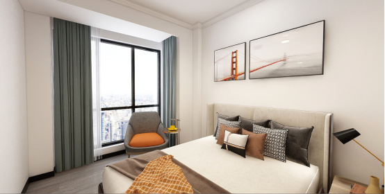 主卧通过空间的色彩、纹理、家具、配饰、光线等表达空间情绪