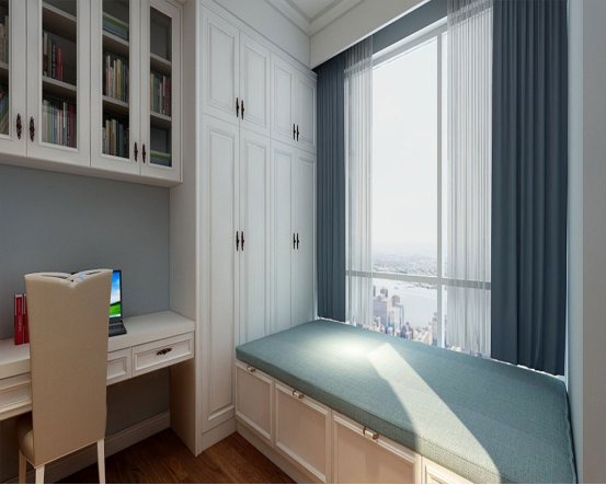 书房的蓝色月白色书柜的组合,书柜的优美线条,榻榻米是一个很好的休息空间!