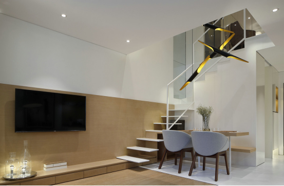 40平米4.8米高度的空间,被设定为两房两厅一卫,简化至单纯的空间反而更具包容性,把洗衣洗漱综合柜及冰箱安放在楼梯之下,轻盈的楼梯踏步巧妙的与视听柜及餐桌椅完美的结合,解决了结构的生根有保证了是觉得简化。位于餐桌上部挑空保证了所有空间的光线充沛与相对独立的安静,一楼从视听墙至楼梯转向平台被延续拉伸的木板,把客厅、餐厅、厨房化整为零在满足所有实用功能的前提下,简化为最极致的单纯。