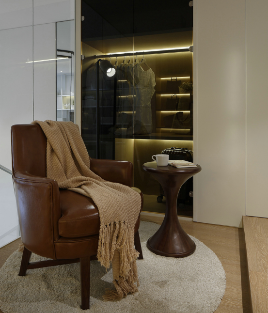 卧室被安放在最靠内的区域,内部隐藏的强大收纳让空间呈现最单纯的安静,玻璃的隔墙确保自然光线的充裕。利用原建筑结构的自然太高安放睡眠区,开放的尺度给日常提供更多的趣味性。