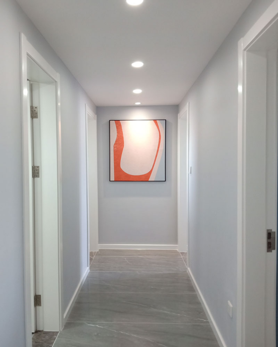 本案业主是一对年轻夫妻,喜欢简洁大方。整体空间浅色系搭配,设计师根据业主的喜好,灰色,原木色,海兰灰,局部白色相映衬,绿色鲜艳跳色进行渲染,画龙点睛,活跃空间,同时为了使空间不那么冷淡,压抑,墙面墙布色彩采用中性暖灰色,以及浅灰色为主。 在大众的眼里,现代简约风是不太接地气的,现代简约适合的人群:甚或标准较高、居住习惯较高,居住习惯十分自律。这对业主夫妻,两个人正好就属于这类人,生活习惯非常好,会每天早起锻炼,定期收纳。对房屋整洁有高要求,希望打扫方便,家里陈设一目了然。 故而当设计师提出现代简约风时,一拍即合。整间房屋基本上就运用了灰、海兰灰、原木、白、四种基调。色彩是低饱和度,灯光的加持,故整个空间显得很舒适。