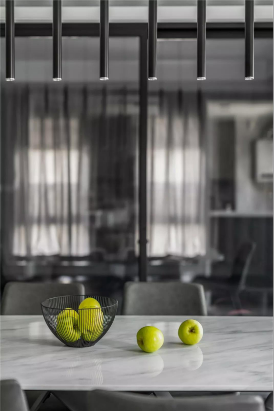▲餐厅整体也是一灰色调的硬装空间,中间布置一张大理石质感的餐桌,顶上一排垂下的长条吊灯,营造出一个时尚大方的空间感。