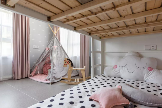 ▲上下床的布置,为孩子留出更加宽裕的活动休闲区,摆上帐篷与木马,成为孩子们玩耍的小天地。