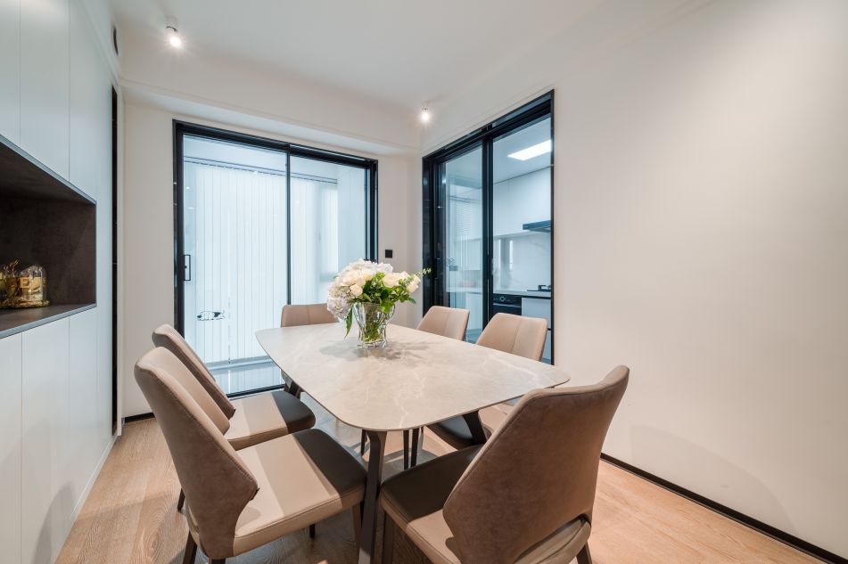 餐厅与厨房之间一门之隔,做好的饭菜可以直接端至餐桌上,动线非常合理。