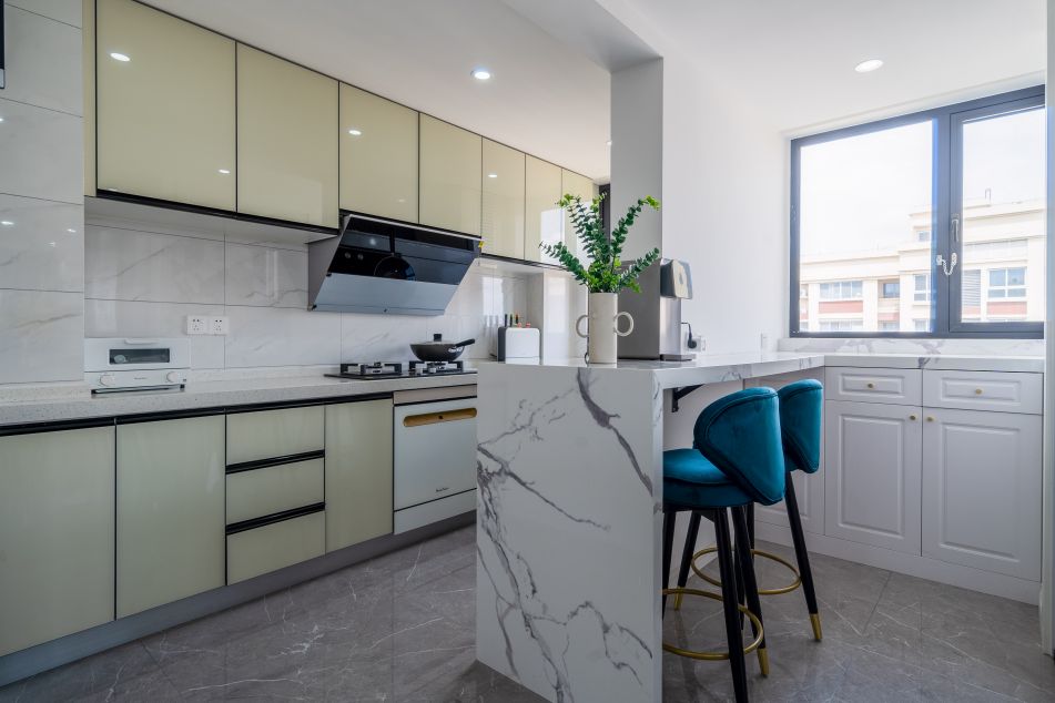 开放式厨房设计增强了三人平时零碎用餐互动时光,赋予了共同的生活乐趣。